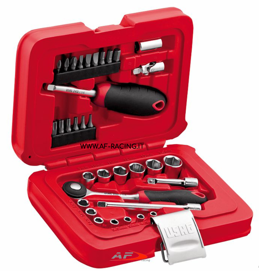 SET COMPLETO USAG IN CASSETTINA DI EMERGENZA PER AUTO 34 PEZZI CON CRICCHETTO , GIRAVITE , BUSSOLE , ESAGONALI,