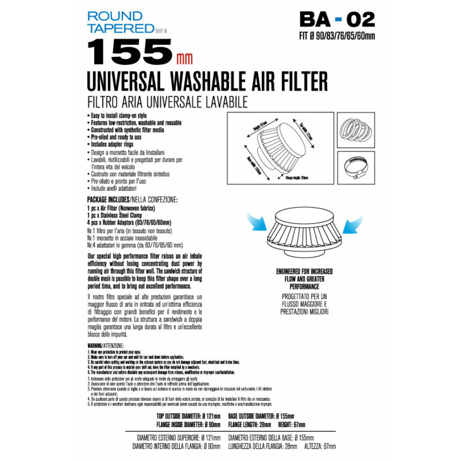 La confezione include: 1 filtro per l’aria (in tessuto non tessuto), 1 morsetto in acciaio inossidabile, 4 adattatori in gomma (da 83/76/65/60 mm).